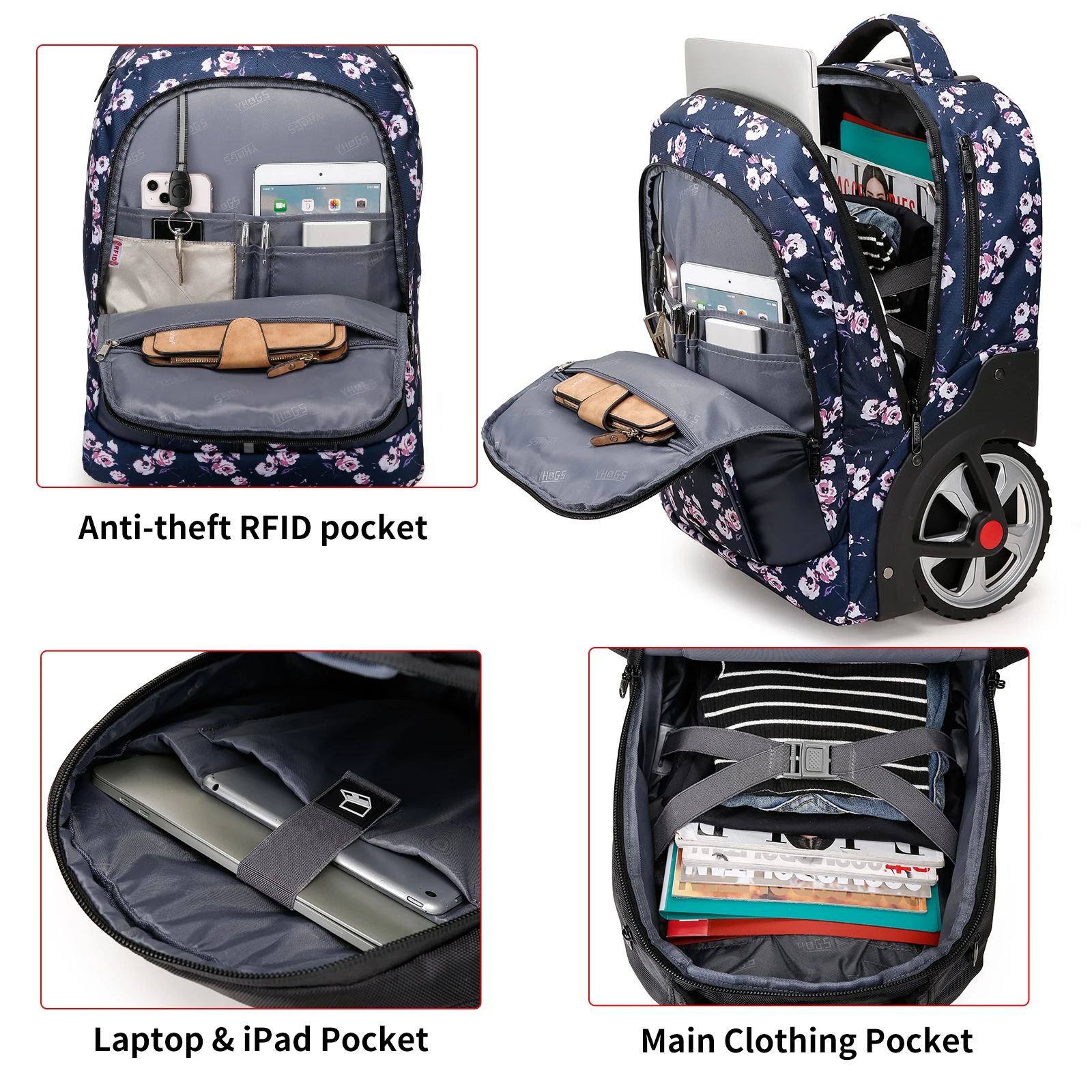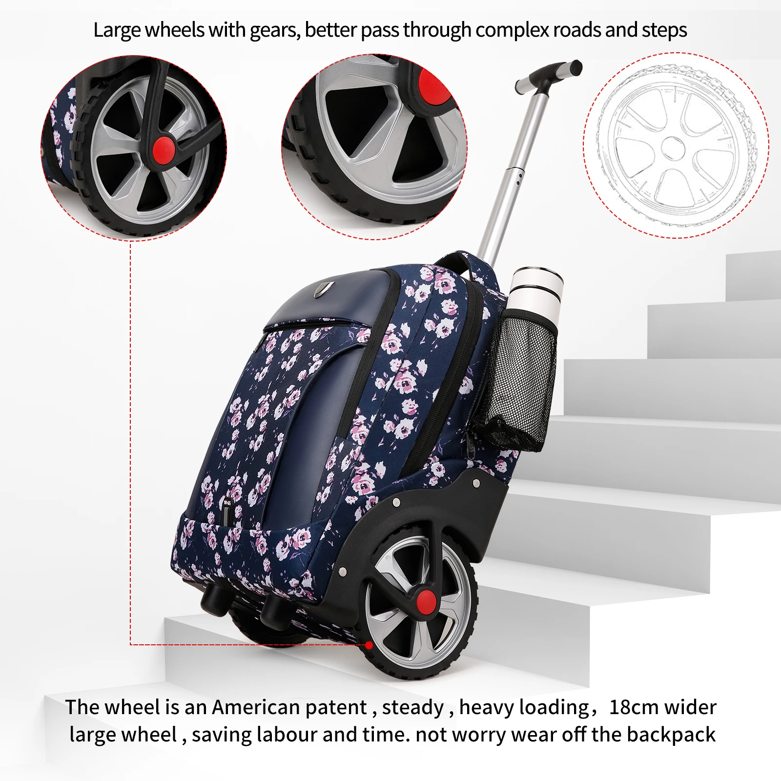Travel smarter with this large capacity travel backpack with wheels, designed for ultimate convenience and versatility. Featuring a hidden pull rod and rolling system, this waterproof backpack easily converts from a carry backpack to rolling luggage, making it perfect for business trips, weekend travel, or daily commuting. The spacious interior includes a dedicated compartment that fits up to a 17.3-inch laptop, along with multiple pockets to keep your clothing, documents, and essentials neatly organized.